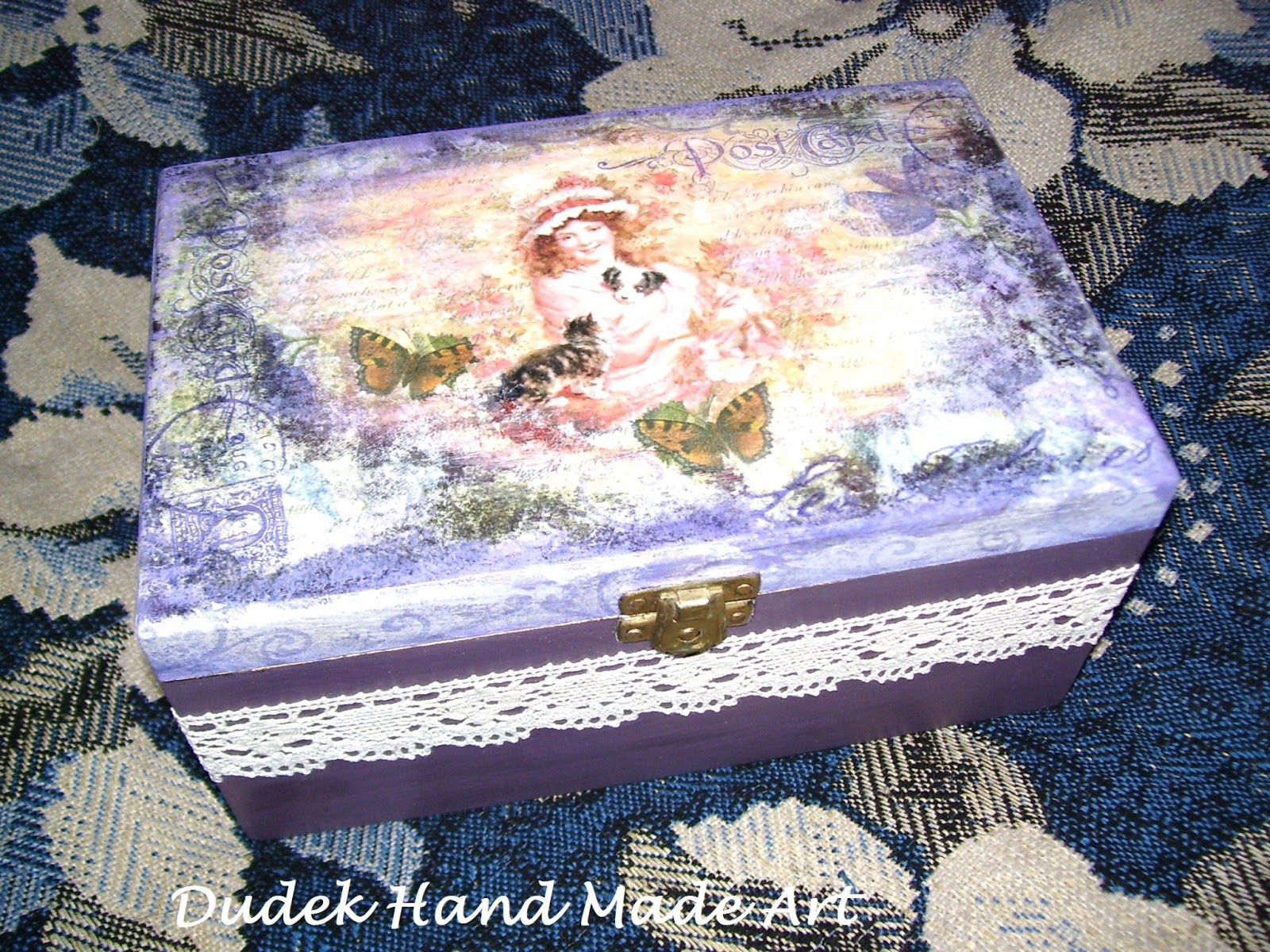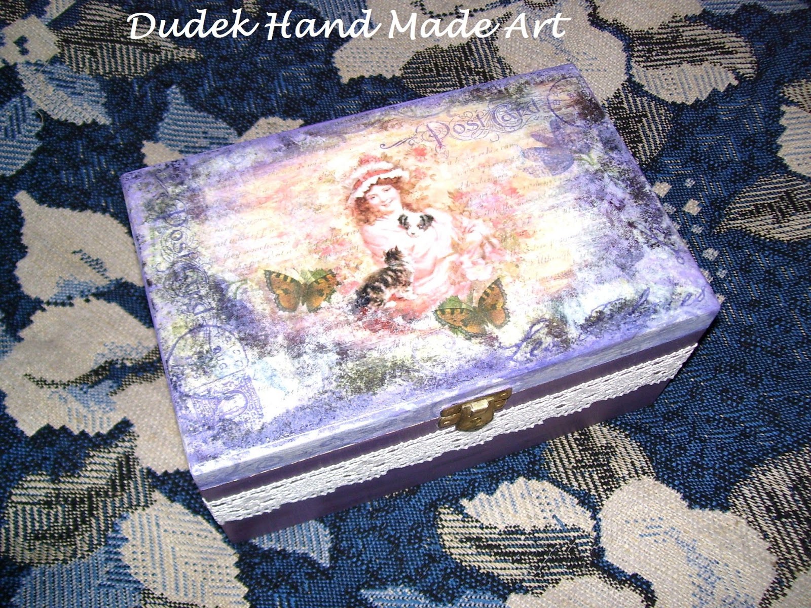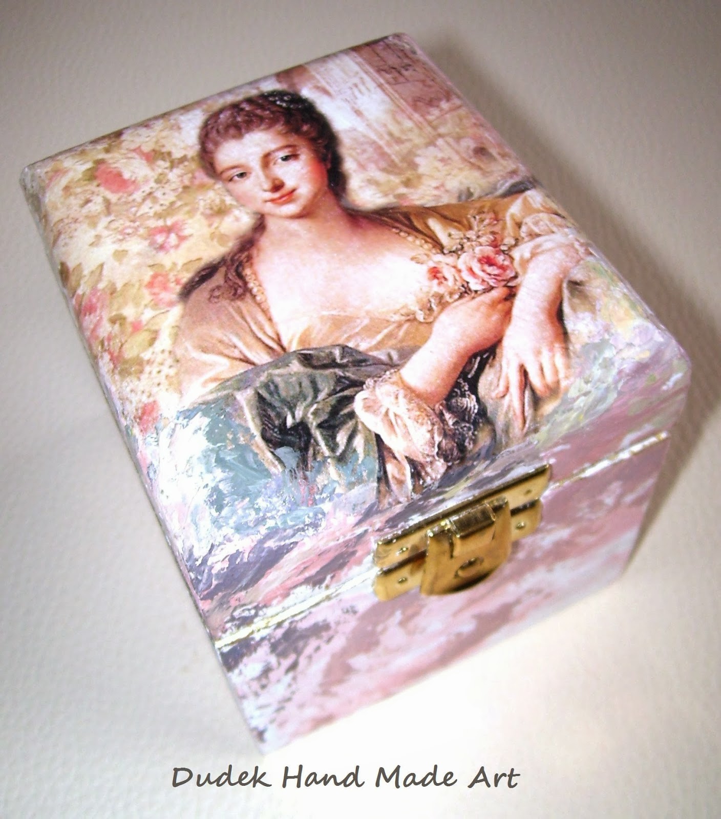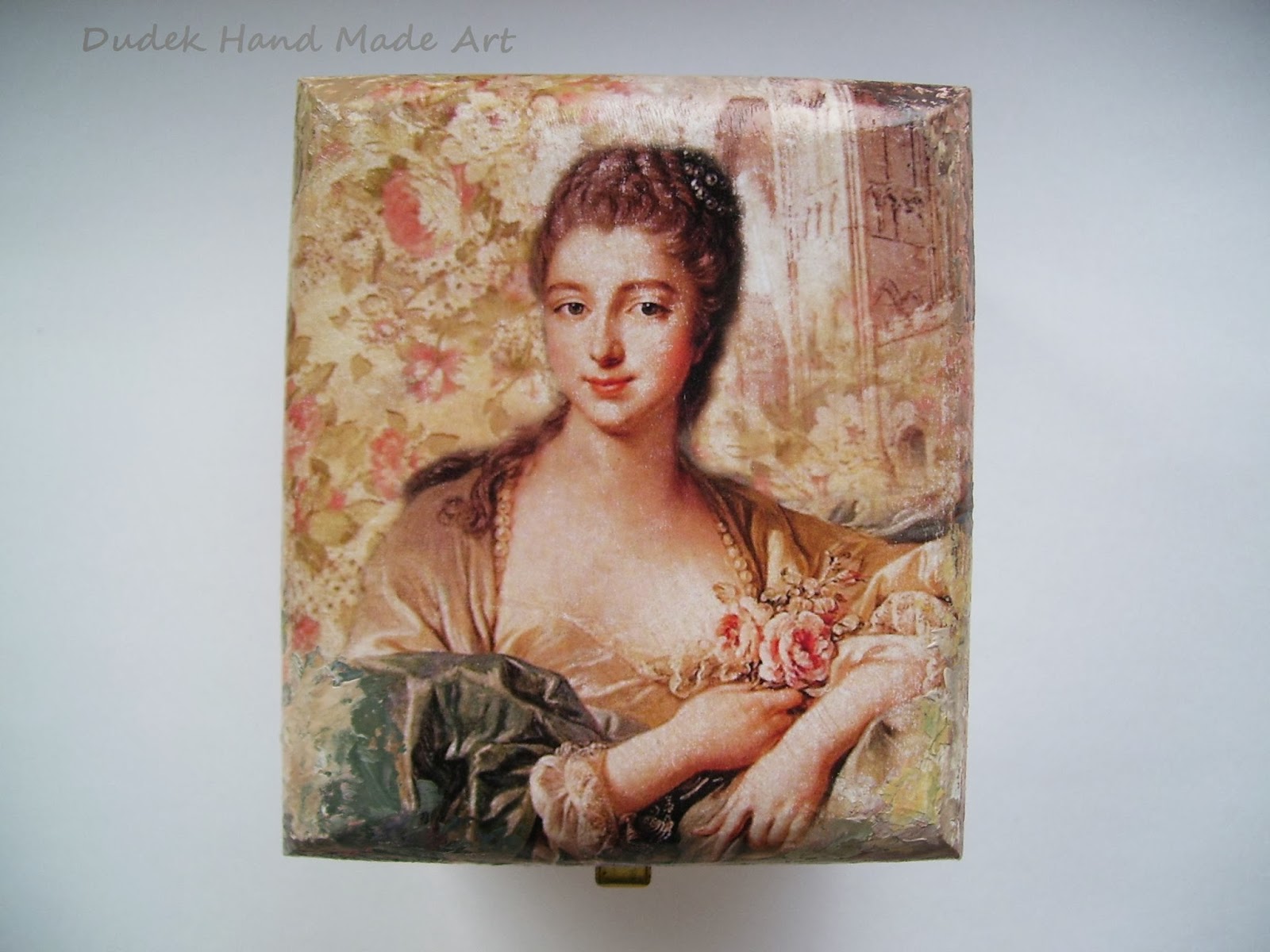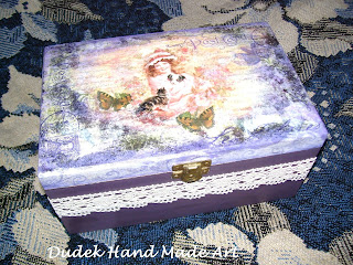 Oto małe pudełeczko: około 8 cm wysokości, 7 szerokości. Dekorowane uroczym wizerunkiem decoupage z przedstawieniem damy i farbami akrylowymi. Dodatkowo zabezpieczone zostało specjalnym werniksem. Cena 30 zł + koszty wysyłki ( 11 zł ).