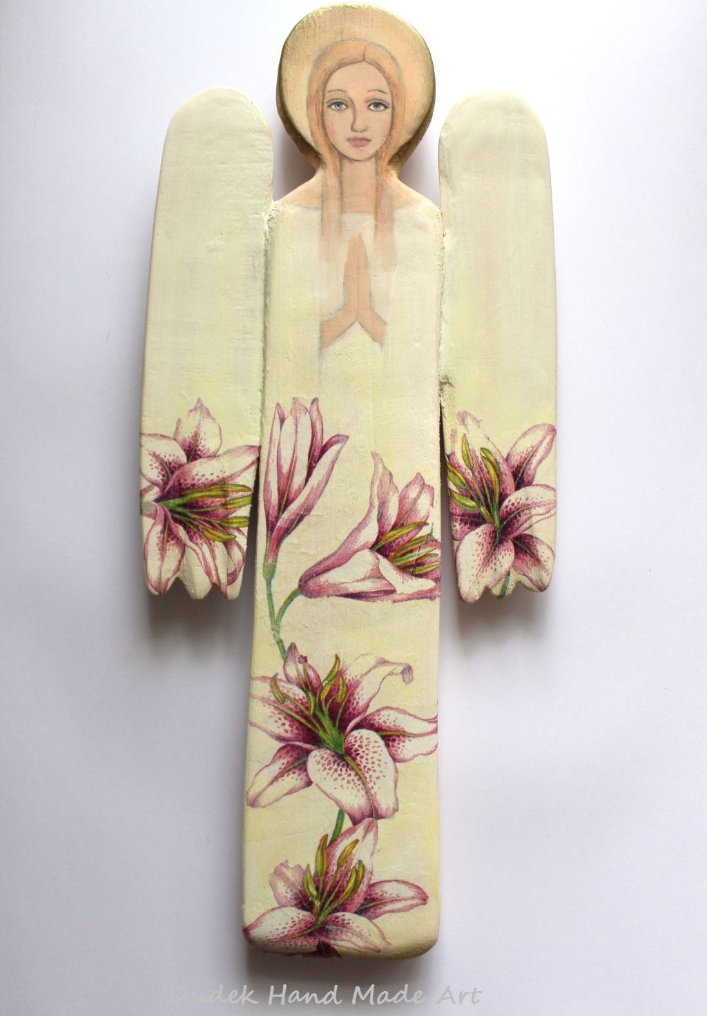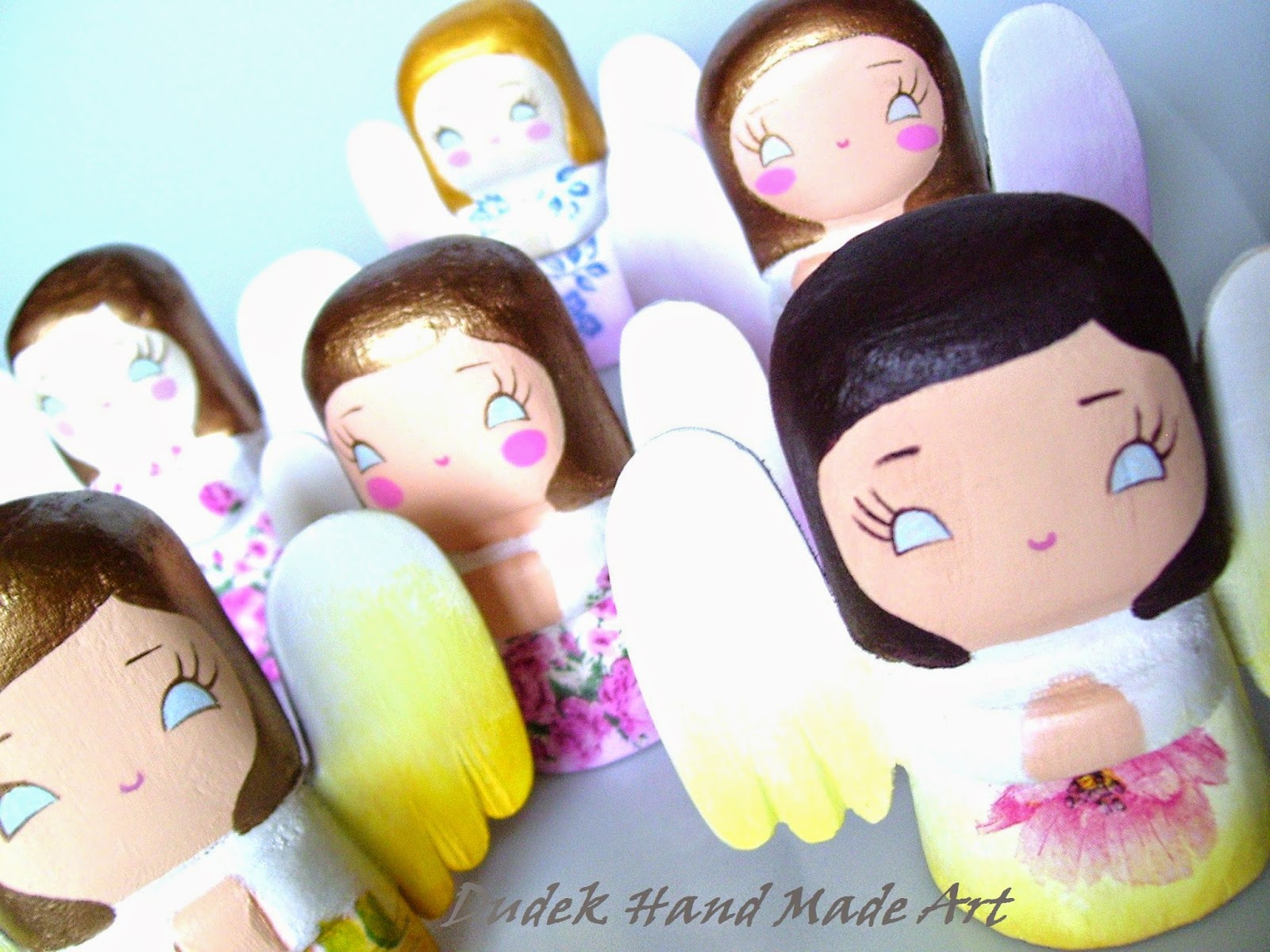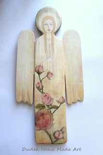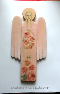 Przedstawiam trzy anioły do zawieszenia na ścianę, wykonane przeze mnie z drewna lipowego i pomalowane farbami akrylowymi. Dodatkowo udekorowałam je motywami kwiatowymi w technice decoupage. Bardzo lubię tę technikę, bo pozwala mym rzeźbom przyoblec się w piękne kwiaty:)