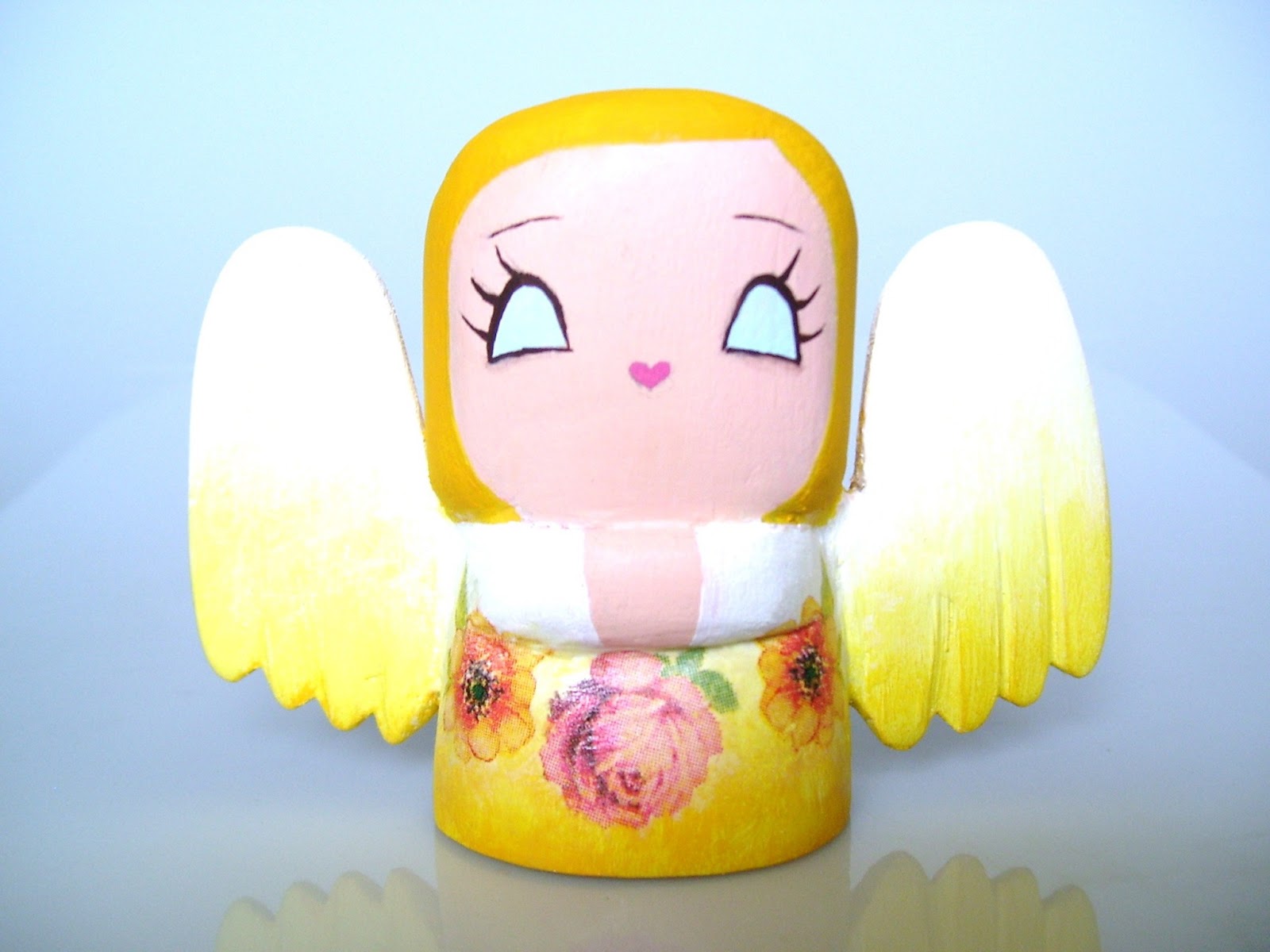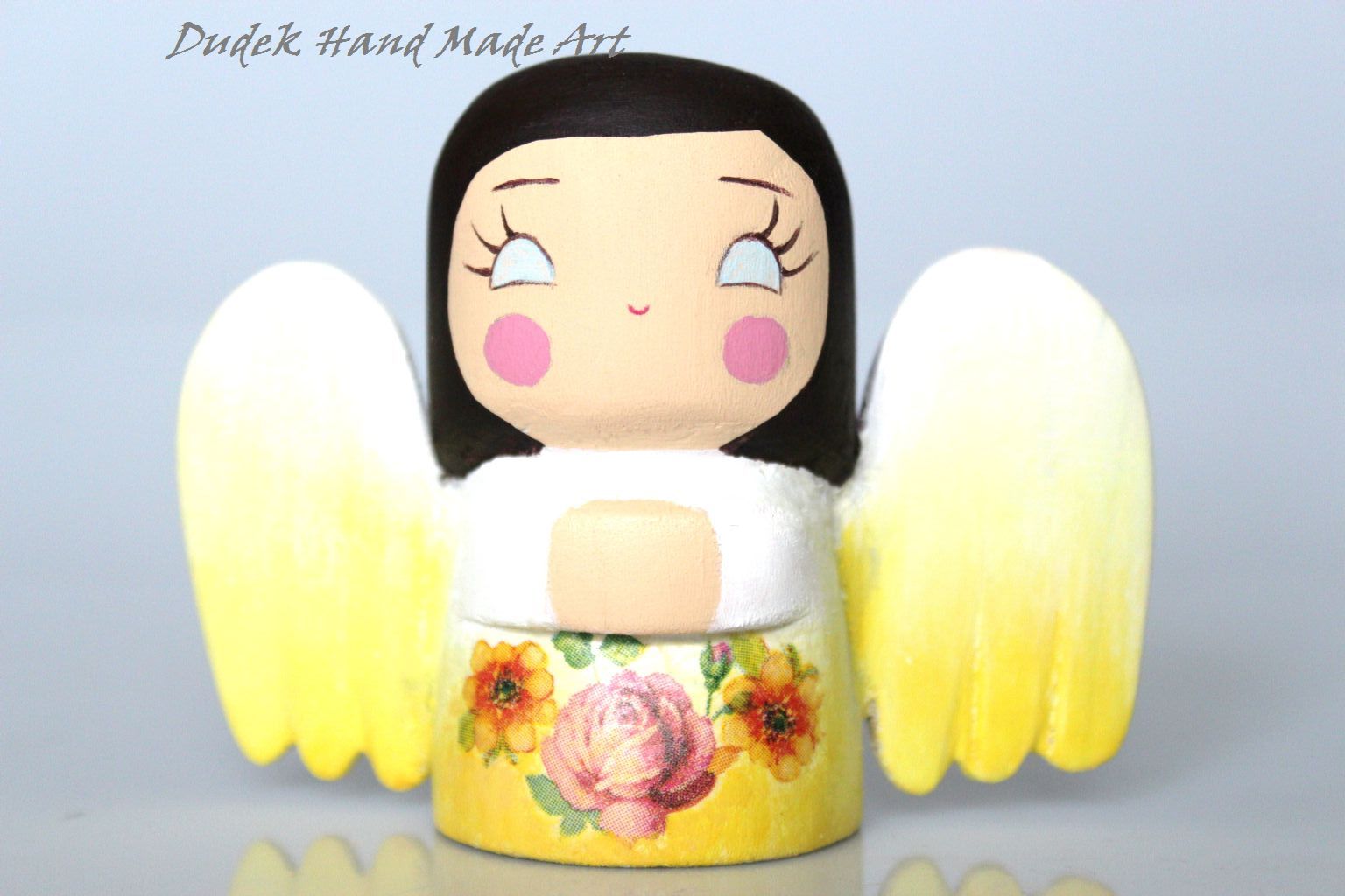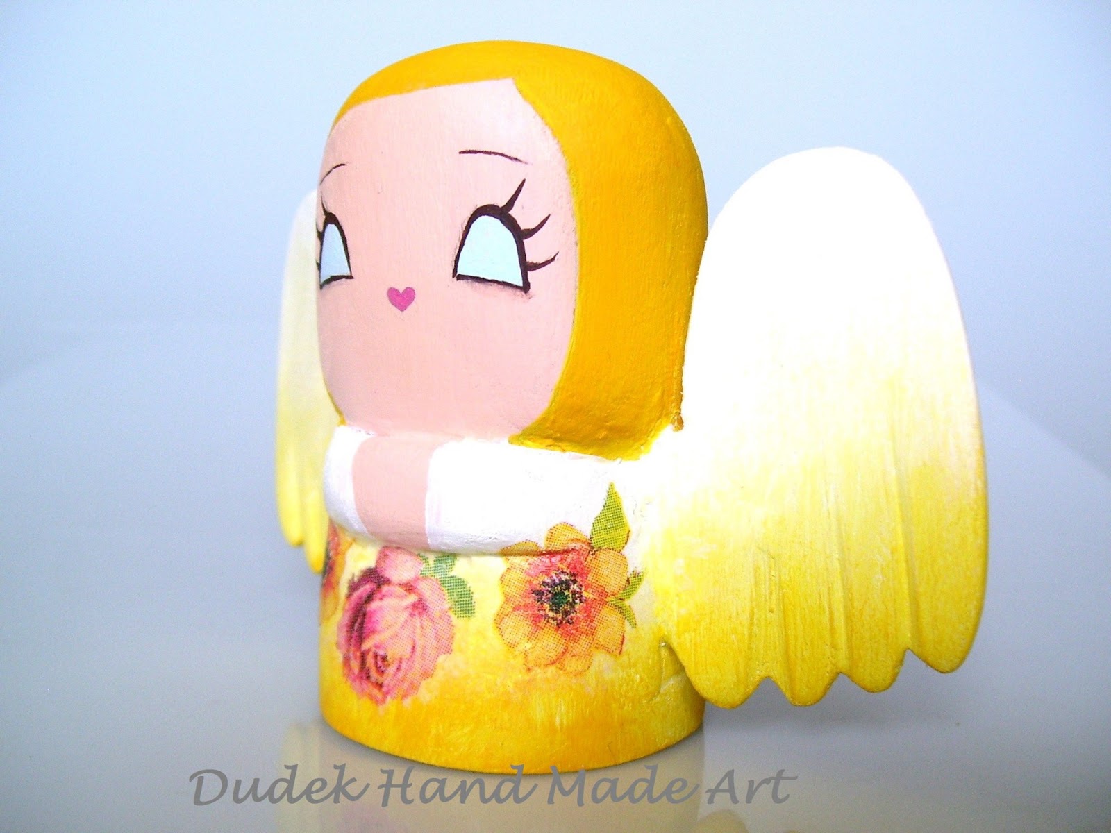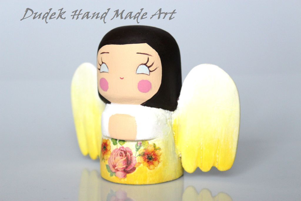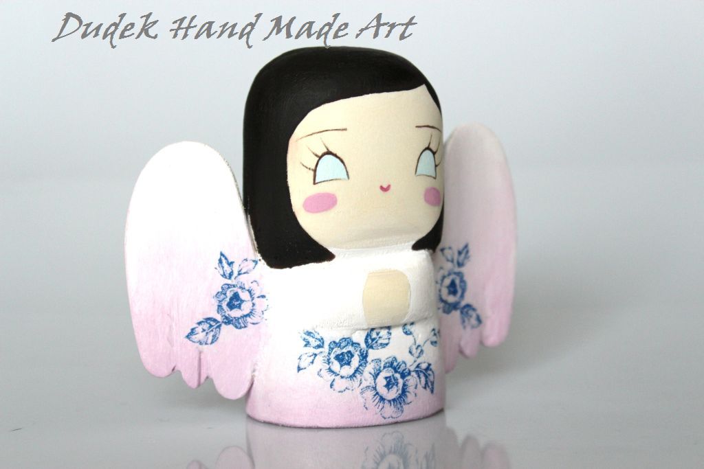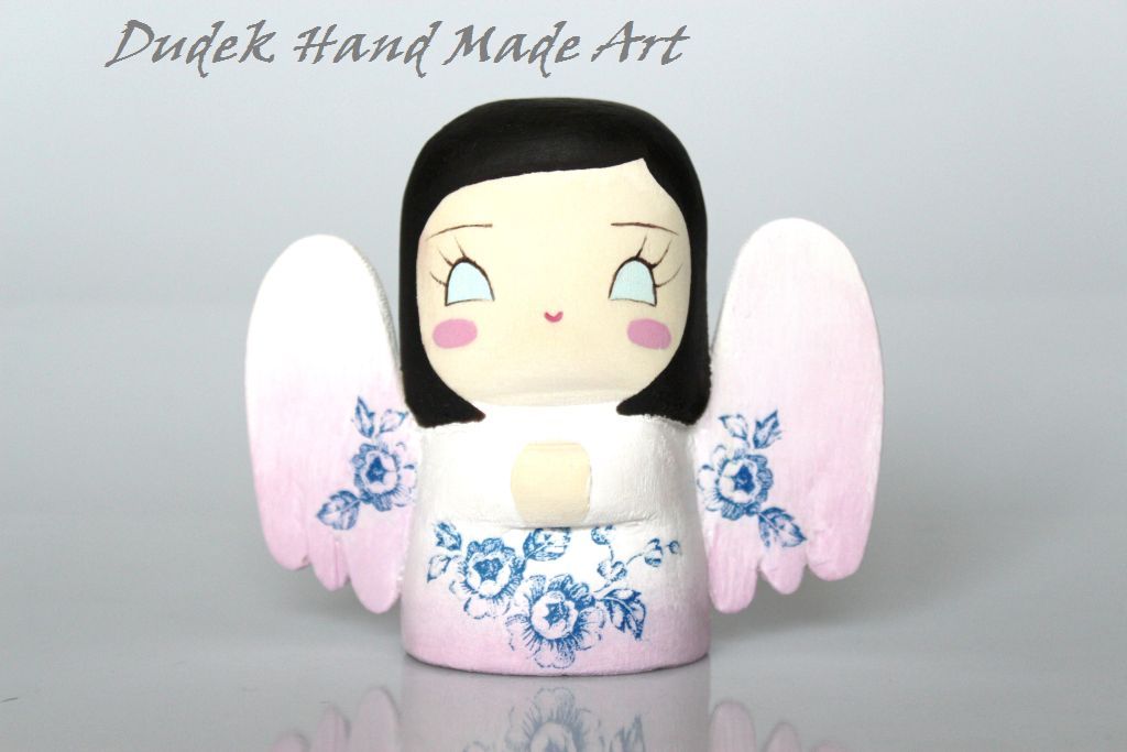 Chciałam Wam przestawić moje nowe maleństwo, które własnoręcznie wyrzeźbiłam, pomalowałam i przyozdobiłam:) Maleństwo jest niewielkie - jak sama nazwa wskazuje - mierzy około 8 cm wzrostu, jest wykonane z drewna lipowego i pomalowane farbami akrylowymi. Spódniczka i skrzydełka aniołka zostały przyozdobione decoupage'm. Całość została zabezpieczona odpowiednim lakierem bezbarwnym. Maluszek idealnie nadaje się na prezent lub na uroczy dodatek do prezentu. Cena: 20 zł + koszty wysyłki ( 6 zł ).
