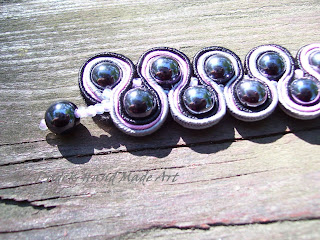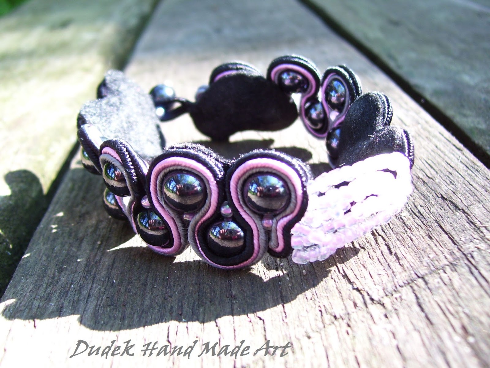 Oto bransoletka na rękę wykonaną w technice sutasz, gdzie dwa fragmenty zostały połączone ze sobą jasnoróżowymi koralikami. Długość: ok. 17 cm, z zapięciem - 19,5 cm, szerokość: 2 cm.