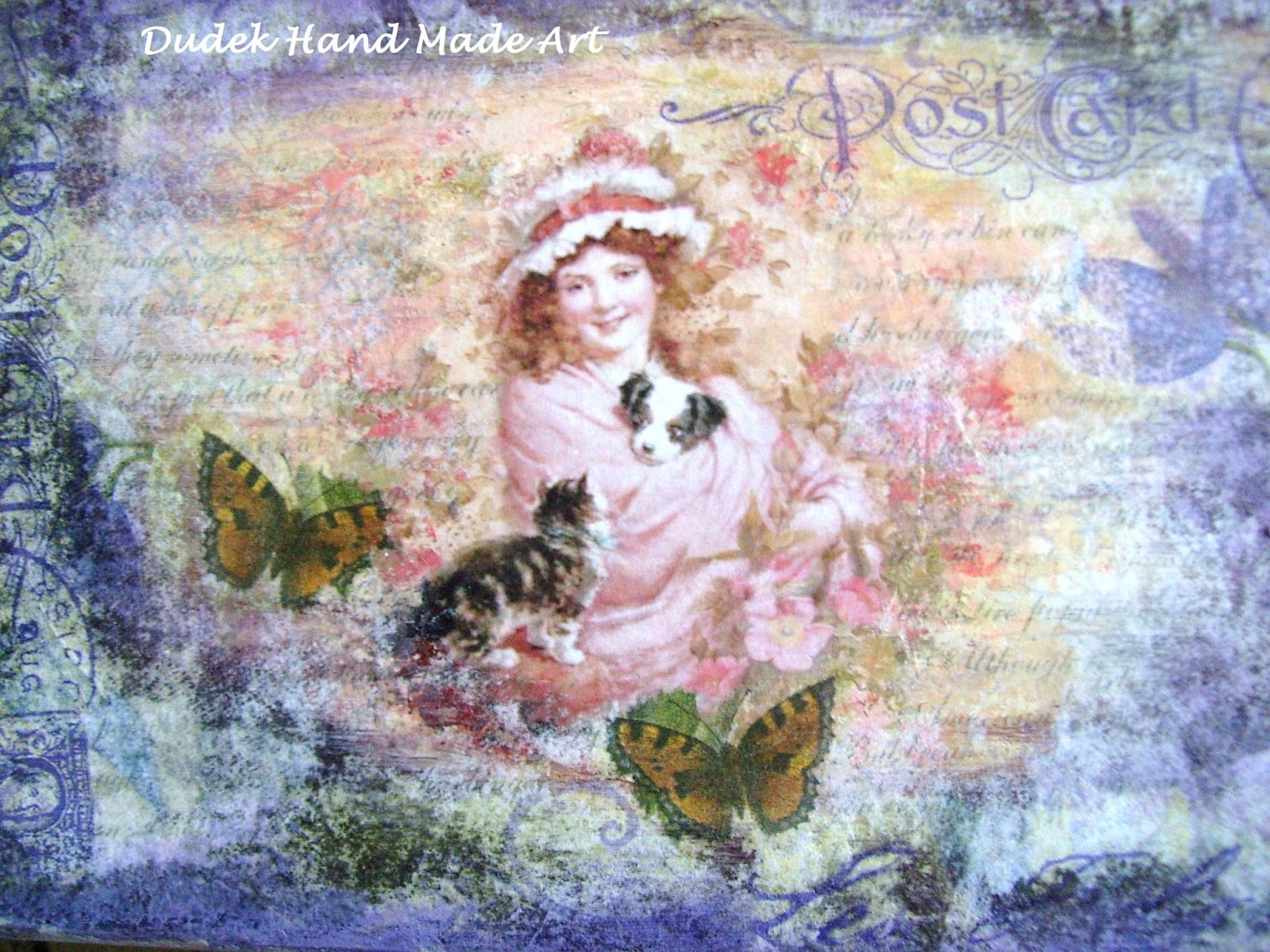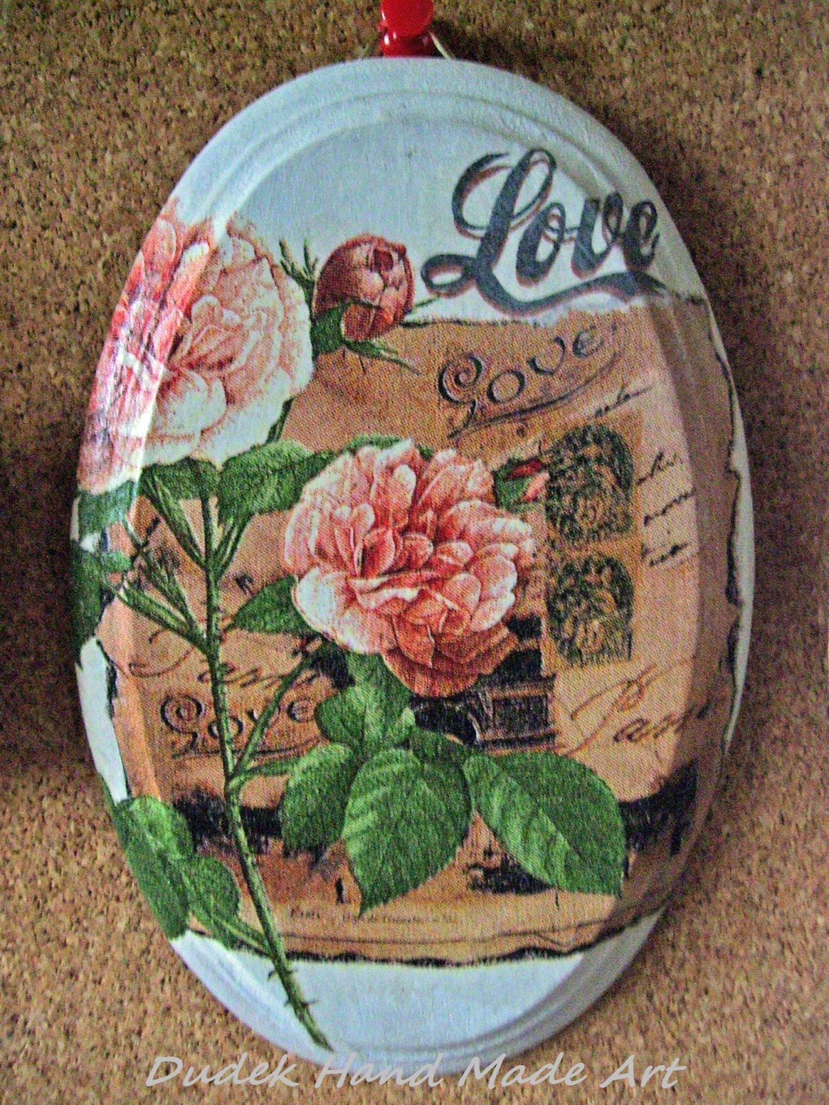 Ten obrazek decoupage powstał podobnie jak wcześniejszy z puttem, na drewnianej płytce. Tym razem jednak postanowiłam wykorzystać uroczą serwetkę. Jak widać utrzymany jest on w zupełnie innym klimacie niż poprzedni. Ale przecież najważniejsze jest to, żeby nie wiało nudą:) Miałam jeszcze co prawda dylematy czy dodać duży napis "Love" czy też go w ogóle tam nie umieszczać. Jednak zdecydowałam się na umieszczenie napisu, gdyż bądź co bądź, to właśnie napis - słowo - nam coś sugeruje. Bez napisu mamy tylko ładną dekorację, natomiast z napisem dekoracja nabiera już głębszego znaczenia. Sprzedane!