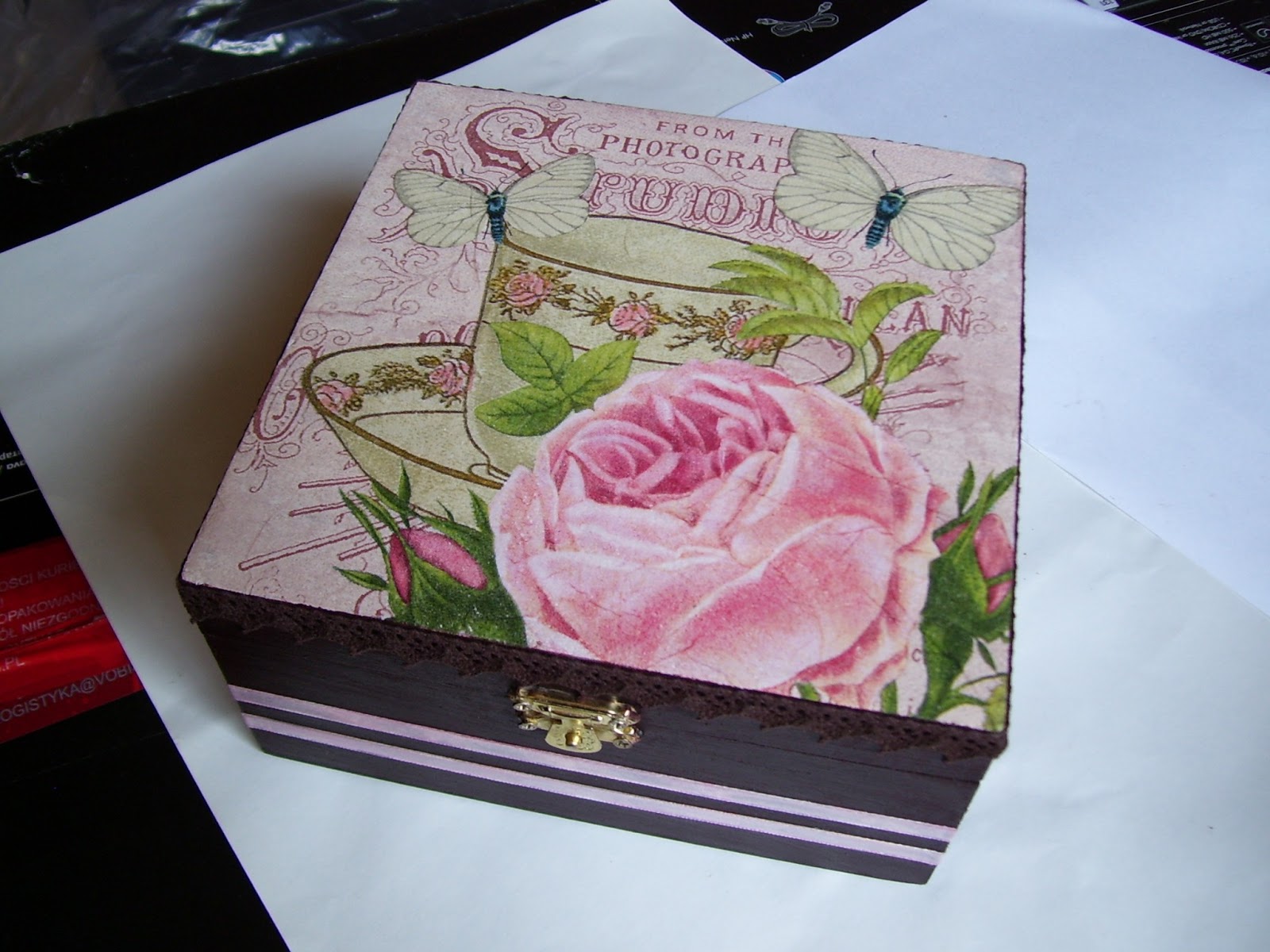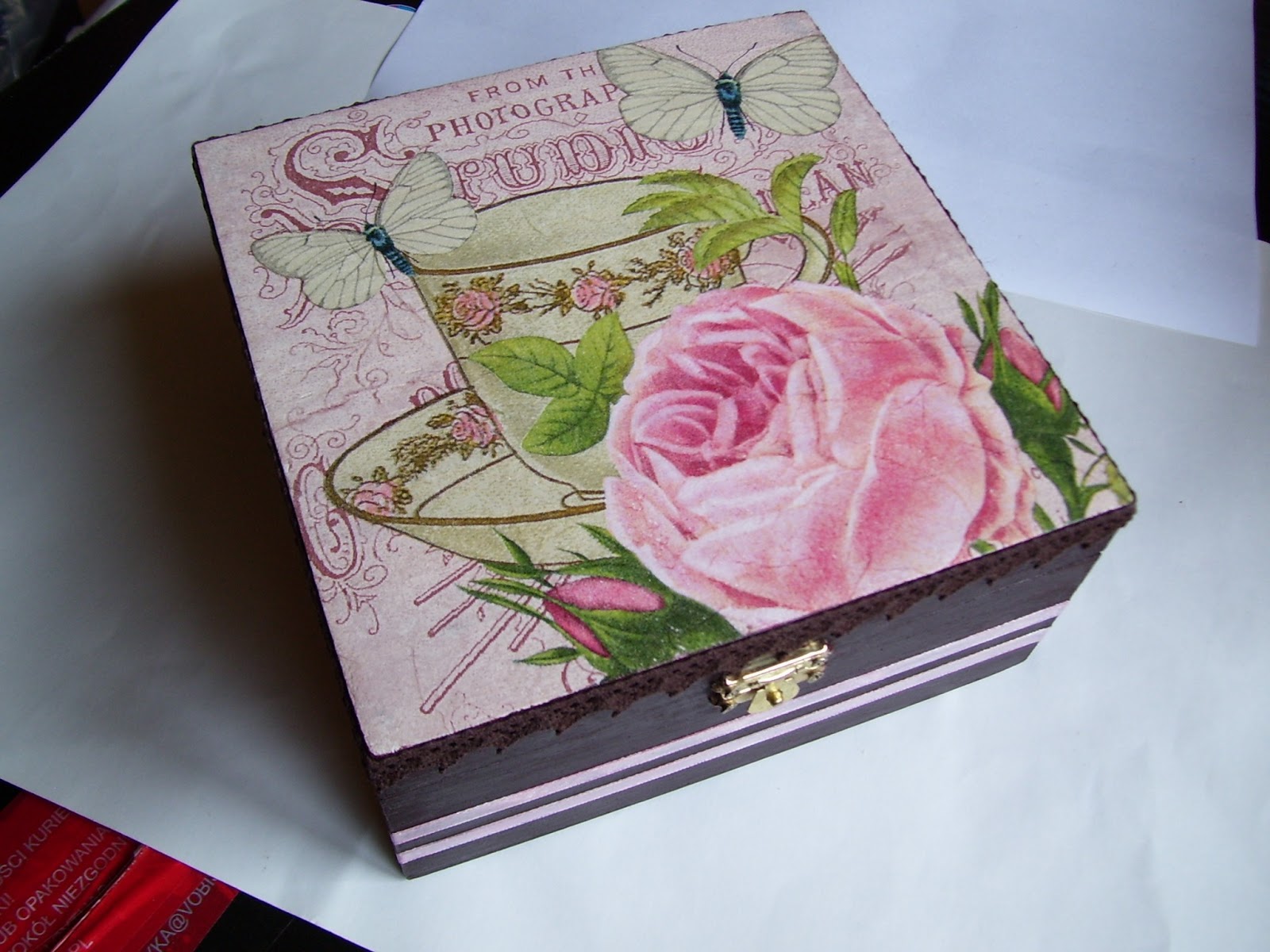 A oto skrzyneczka zdobiona decoupage'm. Dekorowana bardzo ładną brązową koronką i różowymi tasiemkami. Muszę powiedzieć, że dodanie koronki i wspomnianych tasiemek bardzo się opłaciło, bo pudełeczko nabrało przez to wyjątkowej urody:) W środku jest 4 komorowe - deseczki można spokojnie wyciągnąć, wedle uznania. Wymiary to około 15x15 cm.