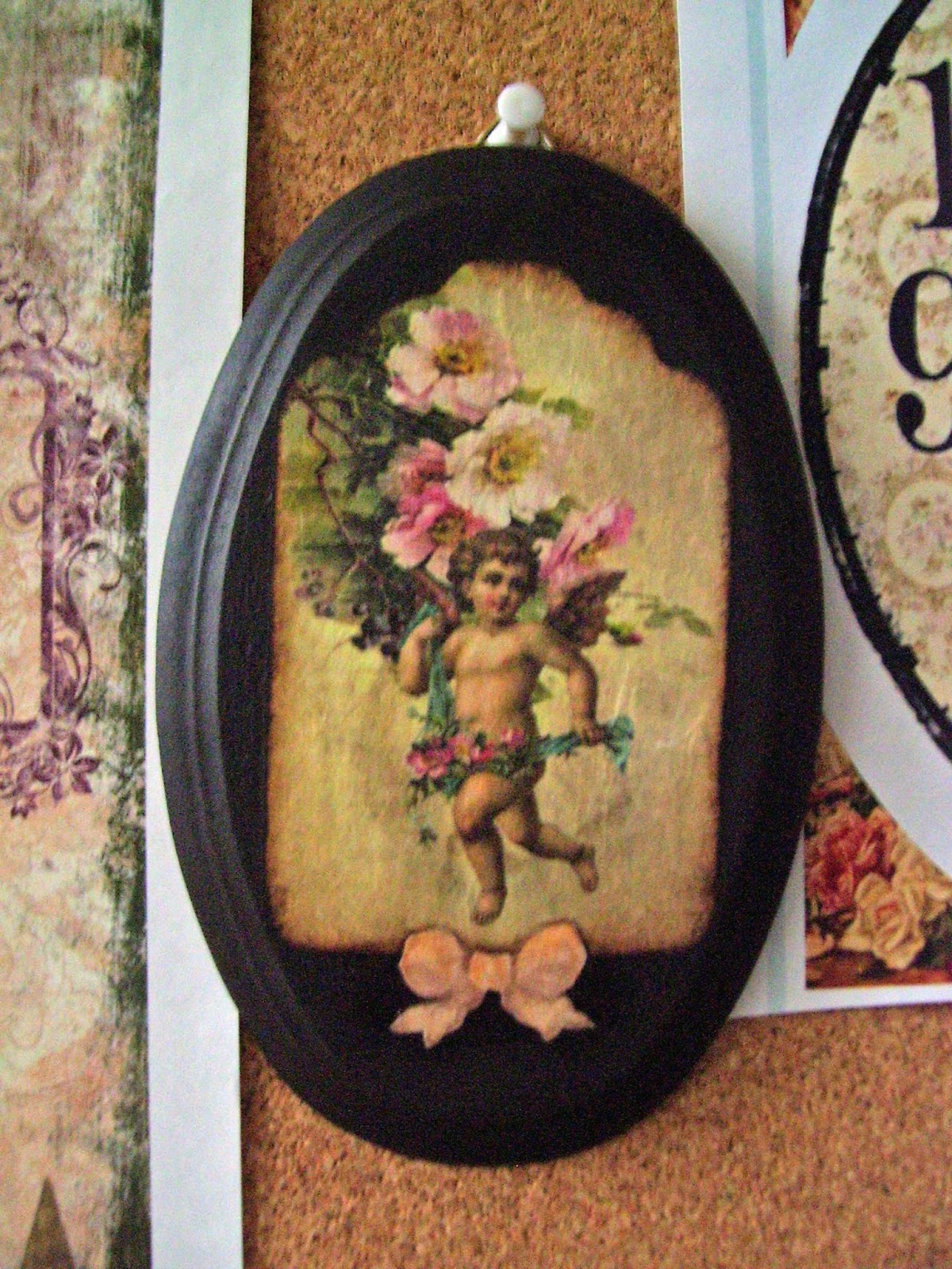 A to obrazek na drewnianej płytce zdobiony papierem ryżowym:) Wyszedł mi chyba całkiem fajne mimo że, zastanawiałam się jak go przyozdobić:) Nie miałam pod ręką żadnego motywu zdobniczego, który by pasował do kształtu plakietki. Zastanawiając się, spojrzałam na moją wielką tablicę korkową- która nota bene robi za coś na kształt wzornika i majestatycznie zajmuje niemal pół ściany:) Putto - wtedy jeszcze część większego papieru zdobniczego - siedziało sobie spokojnie czekając na swoją kolej, zupełnie nieświadome tego, że jego czas właśnie nadszedł:) Po namyśle dochodzę jednak do wniosku, że putto jak putto...... ale za to kwiatki w tle są świetne!