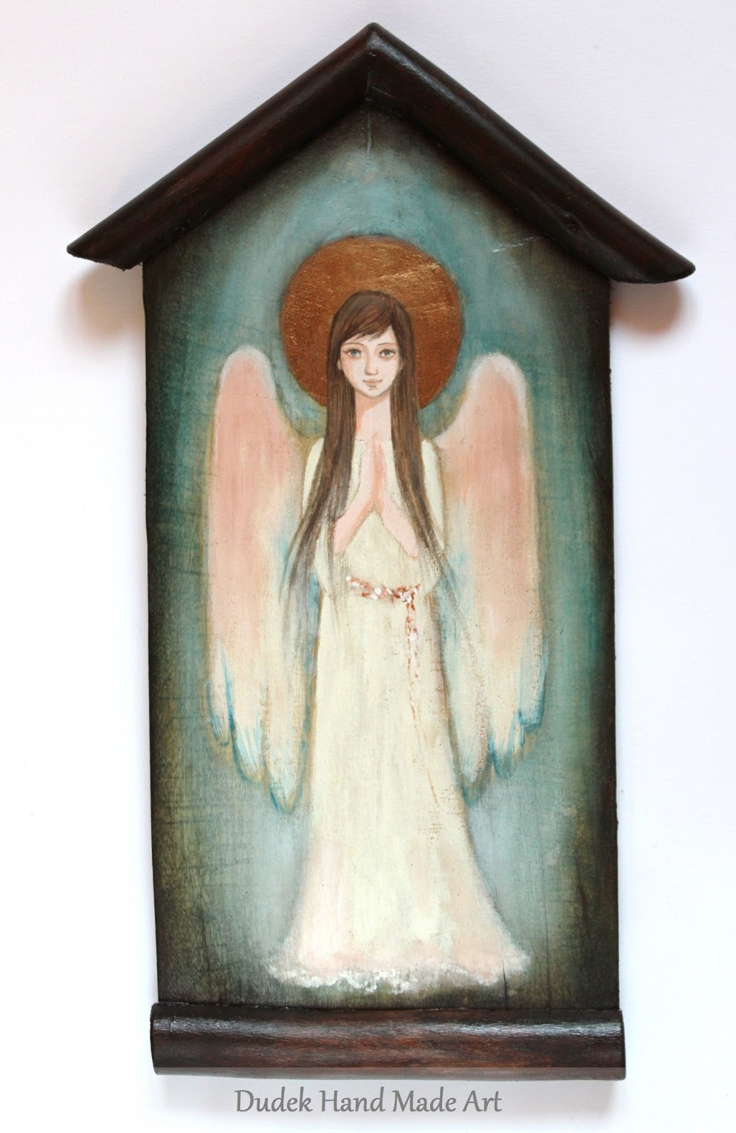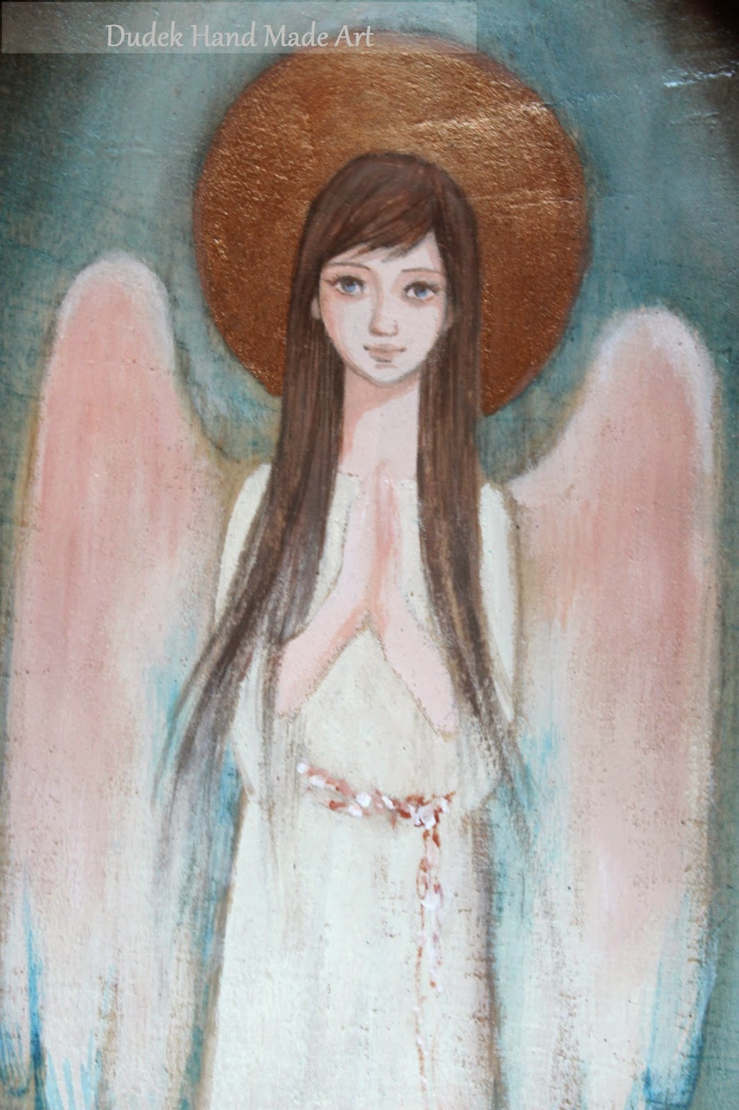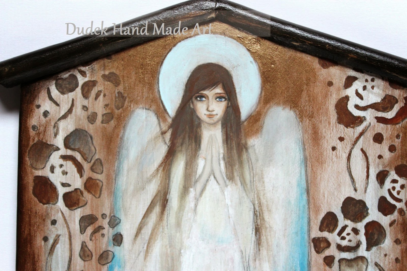 Obraz - Anioł malowany na desce farbami akrylowymi i werniksowany. Dzieło nie dużych gabarytów - wys. ok. 20 cm. Z tyłu metalowa zawieszka - żeby przypadkiem nie odfrunął ze ściany :)