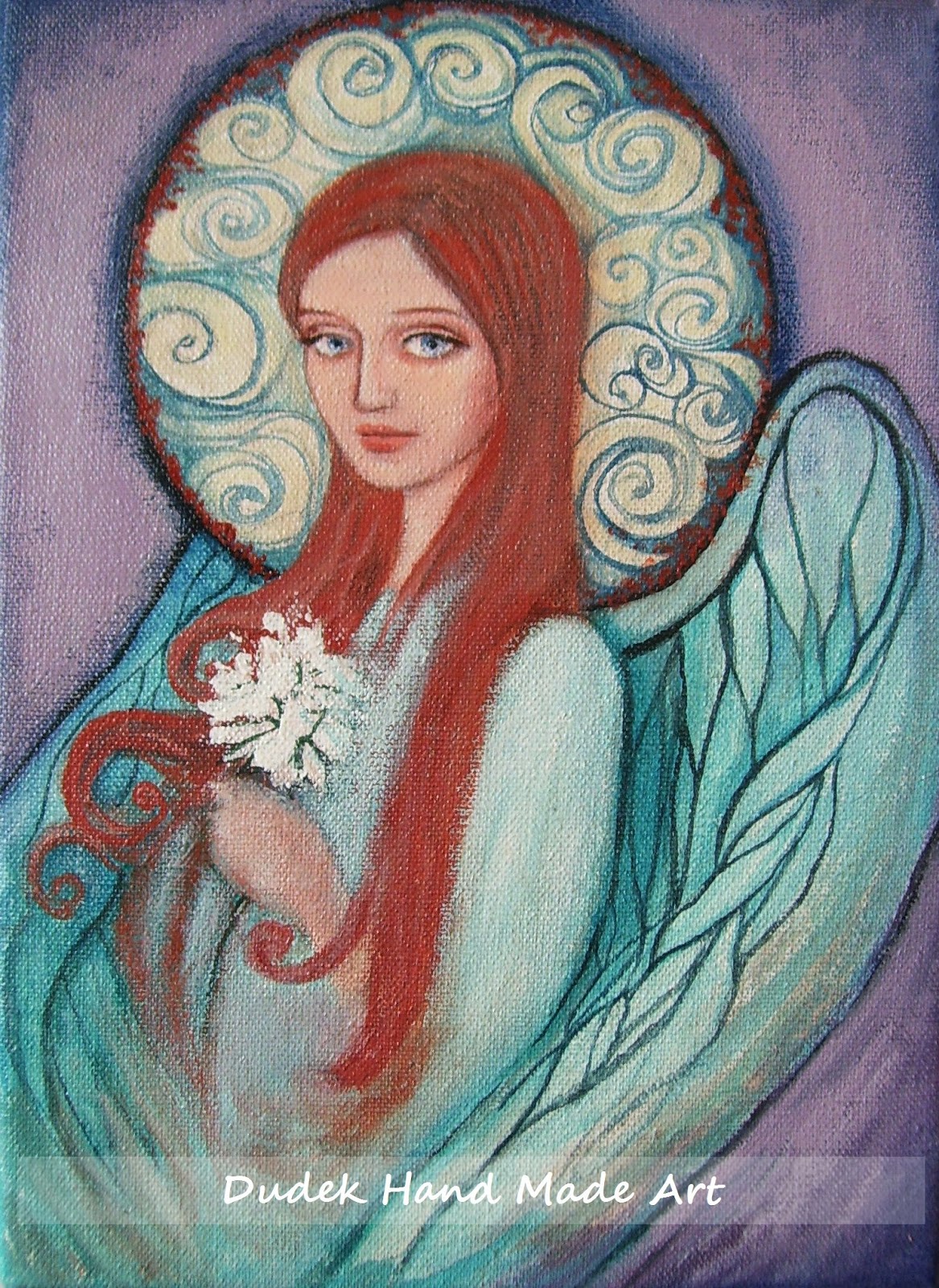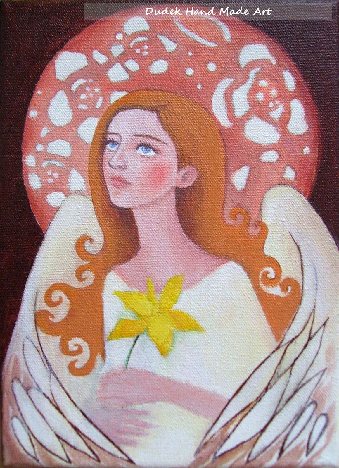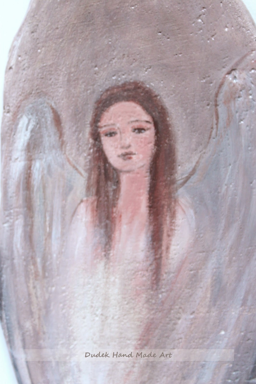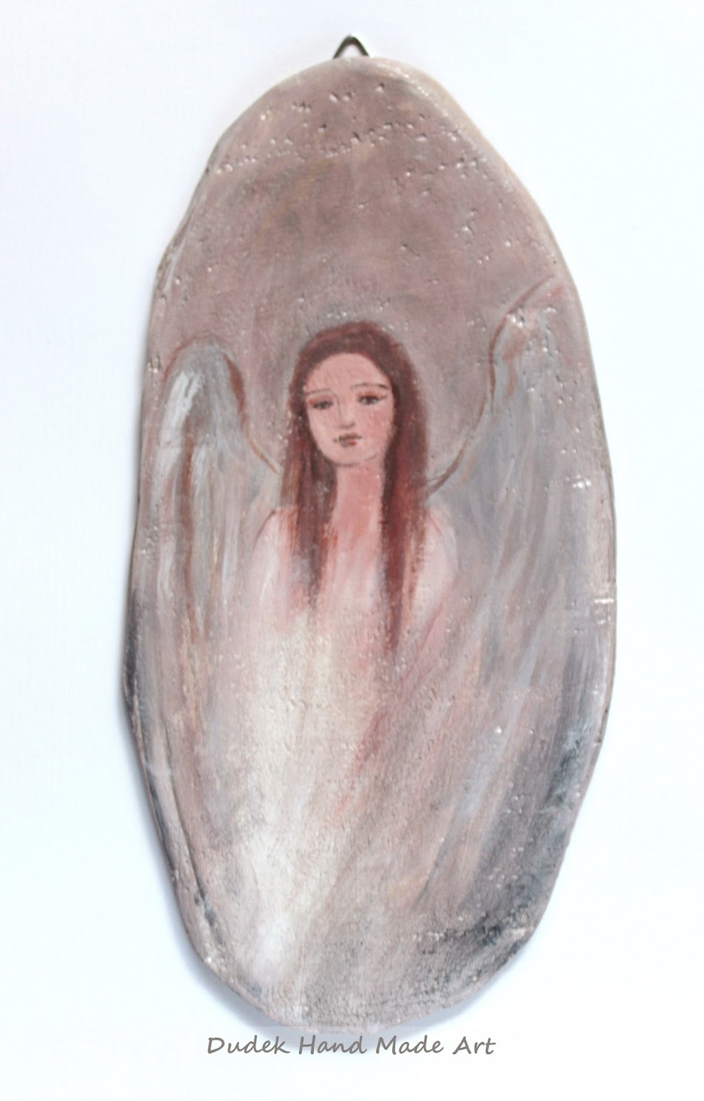 Obraz - Anioł malowany na desce farbami akrylowymi i werniksowany. Dzieło nie dużych gabarytów - wys. ok. 20 cm. Z tyłu metalowa zawieszka - żeby przypadkiem nie odfrunął ze ściany :)