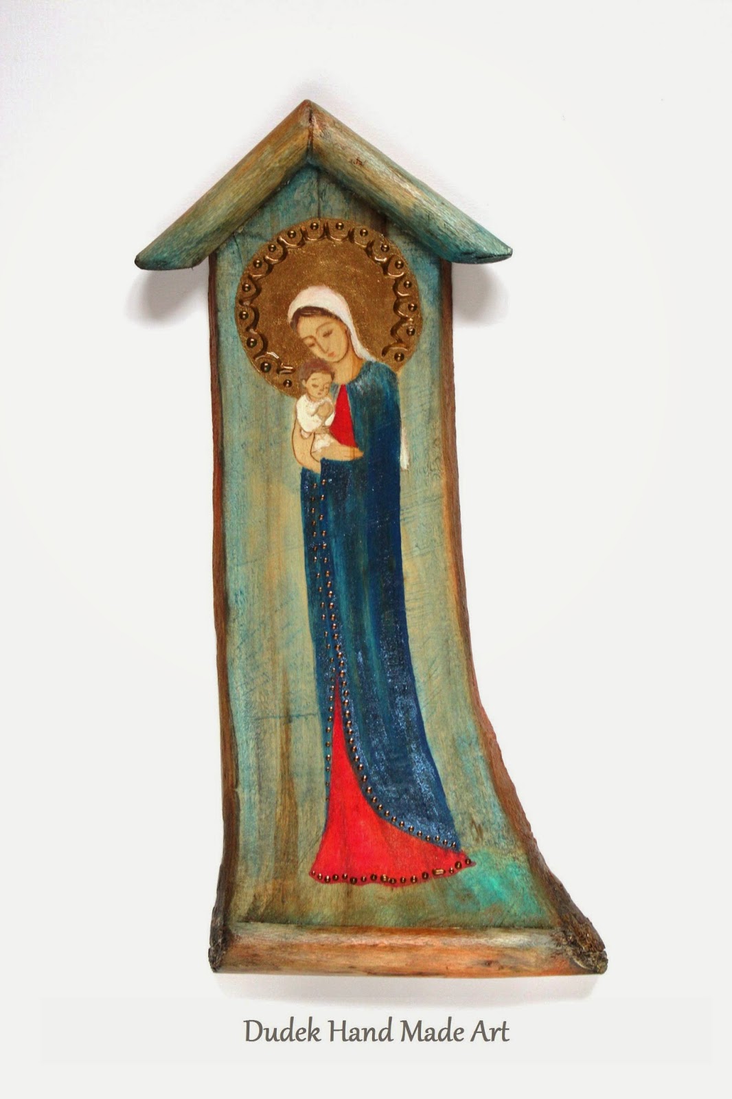 Prezentuję Państwu kapliczki drewniane z przedstawieniem Matki Boskiej z Dzieciątkiem, które wykonane zostały w mojej pracowni. Wszystkie są malowane i wykonywane całkowicie ręcznie. Wysokość prac jest różna - około 30 cm.