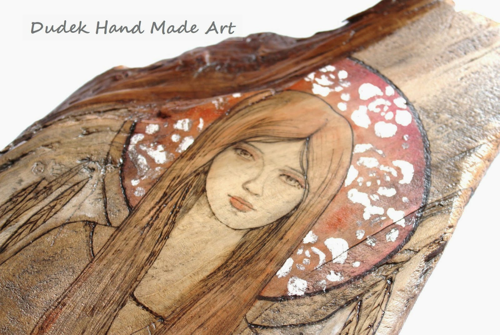 Oto piękny obraz wykonany przeze mnie w całości na desce o nietypowym kształcie. Technika własna, farby akrylowe. Całość zabezpieczona lakierem bezbarwnym - wodoodpornym. Wysokość deski - 46 cm. Z tyłu przymocowany jest solidna, metalowa zawieszka.